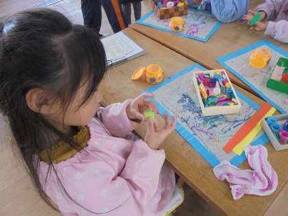 今日も、くるくるした紙をぺたん!と箱の中に貼っていくことを楽しんでいたさくら組。