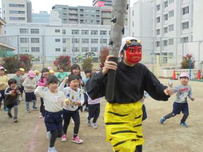 おには〜そと!!!(節分遊び) 公開日 2025/02/03 更新日 2025/02/03 日常の様子 今年の節分は2月2日、日曜日だったので、1日遅れの今日、節分遊びをしました。 豆のいいにおいをかいで、「きなこのにおいがする〜」と楽しんでいると、子どもたちの後ろから何やら人影が・・・! 「おにがきた〜〜!!」 おにはーそと!ふくはーうち!!と言いながら、豆を一生懸命に投げていました。 自分の心の中にいるおにも、追い出せたかな・・・?? いいね(0) 3歳児 4歳児 5歳児