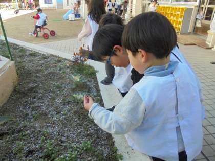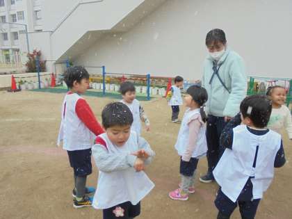 幼稚園に飾っていた雪だるまも外に連れてきてあげると、うれしそうにしていました♪