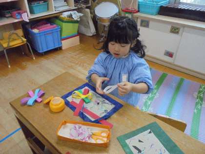 幼稚園をお祝いの気持ちでいっぱいにするために、さくら組がお花の飾りをつくっています。