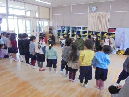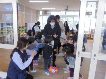 4月に待ってるね!(新入園児一日入園) 公開日 2025/03/24 更新日 2025/03/24 日常の様子 4月から幼稚園の仲間になる友達が、一日入園にやってきました☆ ドキドキしていた友達もいましたが、たんぽぽ組やさくら組が優しく関わってくれて、みんな楽しそうに遊んでいました! 園庭や保育室で仲良く遊んだあとは、在園児からカバンのプレゼント♪ 毎日一緒に遊ぶ日が待ち遠しいですね♪ いいね(0) 3歳児 4歳児