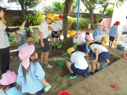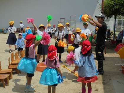 スマイルタイム(幼小交流) 公開日 2025/06/06 更新日 2025/06/06 日常の様子 水遊びで盛り上がっている園庭に、4年生が遊びに来てくれました☆ 幼稚園の子どもたちが踊っているダンスを一緒に踊り、4年生も「楽しい!」と笑顔になっていました(*^▽^*) 砂場では、小学生のパワーでどんどん水の道が出来ていくのを、子どもたちが憧れの眼差しで見ていたスマイルタイムです♪ いいね(0) 3歳児 4歳児 5歳児
