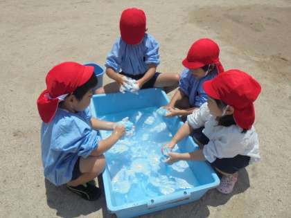 水の中でせっけんを泡立て、こいのぼりを中に沈めると、みんなでゴシゴシと洗っていきました☆