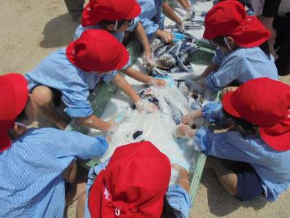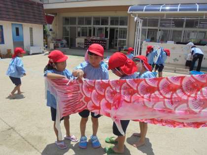 先月、園庭で気持ちよく泳いでいたこいのぼりたちですが、今日はばら組がお洗濯!