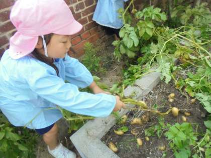 そこで、ばら組とさくら組が、自分たちで植えたジャガイモを掘ることにしました♪
