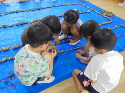保育室の中で収穫したジャガイモを並べ、大きさや形を比べたり、数を数えたりしてみました。