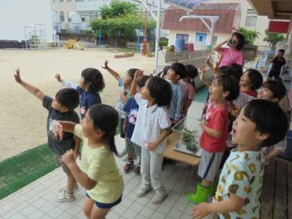 みんなでチョウを見ながら「かわいいなあ」「ごはん入れてあげないとあかんなあ」などつぶやていました。