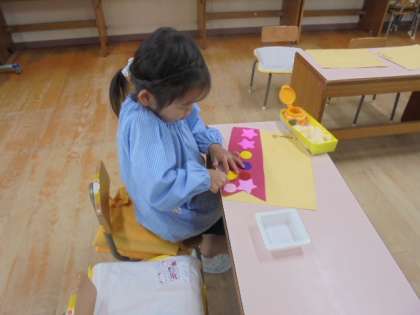 星がきらきら(3歳児) 公開日 2023/06/12 更新日 2023/06/12 日常の様子 丸や星形の紙を、好きな色の台紙に貼りました。 のりをつけて、ペタン! 「先生、できた〜!」 たくさん貼ったところを、先生に見てもらってうれしそうにしていました! いいね(0) 3歳児