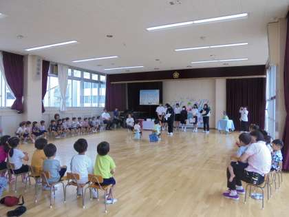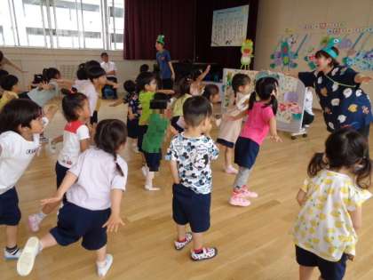 6月誕生会 公開日 2023/06/15 更新日 2023/06/15 日常の様子 蒸し暑い気候の中、6月の誕生会を行いました。 職場体験に来てくれている中学2年生のお兄さん、お姉さんからも楽しいクイズをしてもらい、盛り上がりました♪ カエルの友達や先生もやってきて、みんなで“かえるのたいそう”いっちに いっちに! あ〜楽しかった!! いいね(0) 3歳児 4歳児 5歳児
