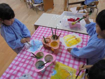 冷蔵庫(絵を乾かす棚)に入れて、また明日、見てみようね!