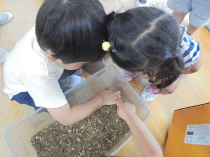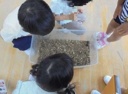 土の中からこんにちは!(3歳児) 公開日 2023/06/27 更新日 2023/06/27 日常の様子 「なんかいてる〜!!」 お昼ごろ、カブトムシの幼虫が眠っていた土の上をもぞもぞと何かが歩いていました。 「知ってる!!カブトムシやで!」 待ちに待ったカブトムシが、成虫になって出てきてくれました☆ ♪ハッピバースデー トゥーユー♪ 自然と歌を口ずさみ、カブトムシになったお祝いをしました(^^♪ いいね(0) 3歳児