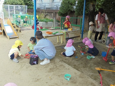 未就園児の友達が、園庭の遊具でのんびり遊びながら、園児と一緒に遊びました。