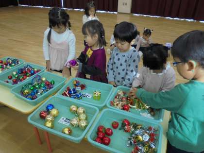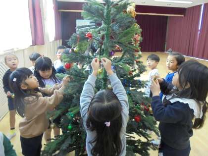 一番上に大きな星があるだけの、ちょっぴり寂しいツリーにみんなで飾りをつけました。
