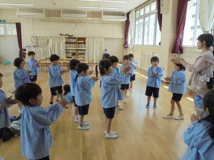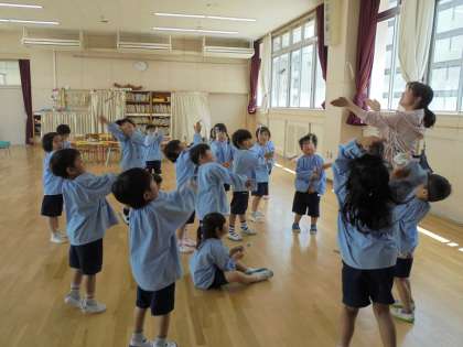 遠くまで行くように気持ちを込めながら手をこすり合わせ、「えいっ!」と押し出し、くるくる回りながら飛んでいく竹とんぼを追いかけて、楽しそうにしていました(^^♪