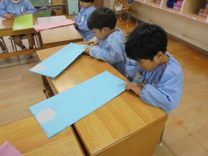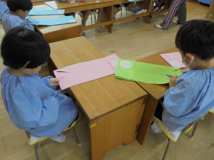 さくら組は、画用紙を尾びれの形に切ってみようと、挑戦してみました。
