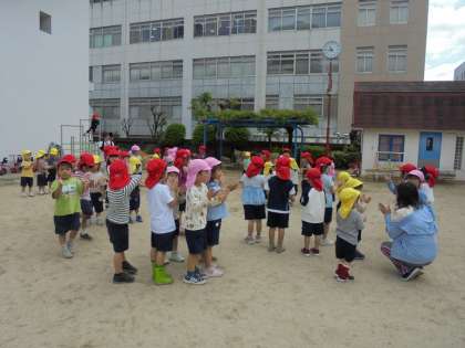 園庭の遊具を片付けた後、みんなで歩いたり体操をしたりして、一緒に体を動かして遊んでいます。