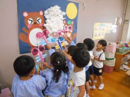 みんなでつくった壁面飾りを、先生がすぐに壁に貼っていました☆