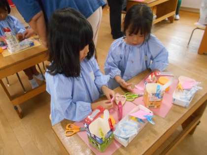 製作の途中で、ばら組の子どもが真剣な顔で話していました。