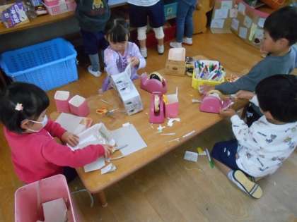 みんなの家からいつも持ってきている箱や牛乳パックなどを使い、思い思いに好きなものをつくっていました☆