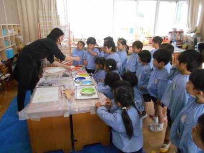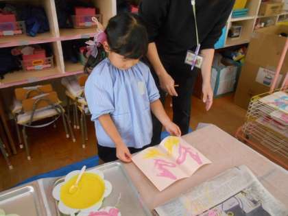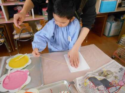 糸を、シュッ!!(4歳児) 公開日 2025/11/11 更新日 2025/11/11 日常の様子 いろいろな色の絵の具の中に、たこ糸が1本ずつ入っていました。 さくら組の子どもたちは、興味津々で先生の話を聞いています。 糸をそ〜っと紙に乗せて、紙をパタン! そして・・・糸をシュッ!! 紙にはさんだ糸を素早く抜いて、開いてみると、素敵な模様が出来上がり!! 色を変えると、もっときれいな模様になりました♪ いいね(0) 4歳児
