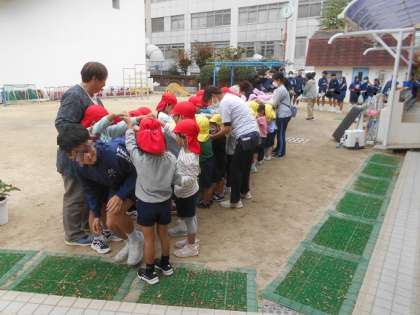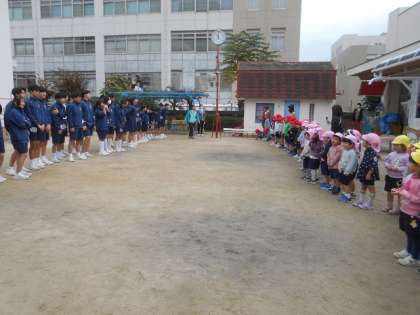 子どもたちが精一杯手を高く上げてつくったトンネルに、中学生のみなさんが体を小さくして通っていってくれました♪