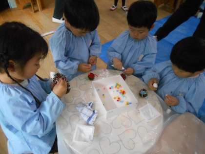 さくら組の子どもたちが、お部屋の飾りにしようと、みんなでまつぼっくりに毛糸をくるくると巻き付けていました♪