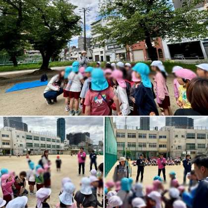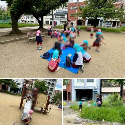 雨で延期すること2回、3度目の正直の今日は気持ちいい風が吹く中、遊具で遊んだり、草花を摘んだり、みんなで体操をしたりして遊びました♪