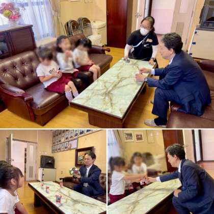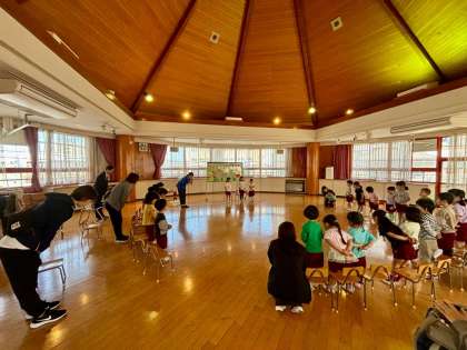 4月・5月生まれの友達は3人。園長先生と園長室でスペシャルなリンゴジュースをいただいてから、誕生会にレッツゴー☆