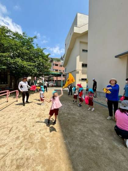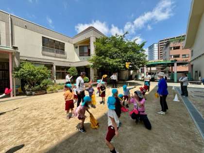 ビブスやマーカーを使って、いろいろな遊びを楽しみました!投げて、キャッチ!運んで、走って、スキップをして!身近なものがどんどん楽しい遊具に変身しました♪
