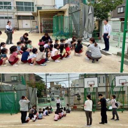 前回は、5歳児の姿を4歳児が見学していたので、2クラス揃っての避難訓練は今回が初めて!非常ベルの大きな音にドキドキしながら、大淀小学校の南門前まで避難することができました。