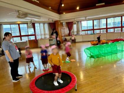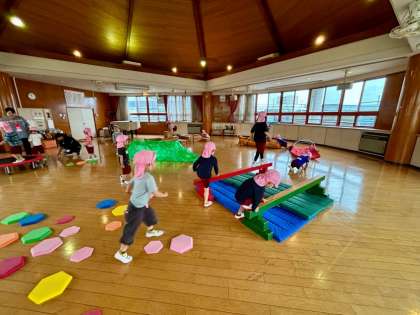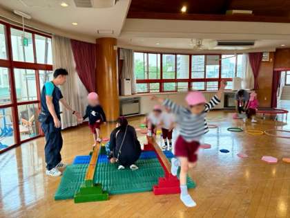 5歳児がつくったアスレチックに、4歳児が遊びに来ました!!初めてみる遊具やアスレチックコースに、4歳児のワクワクが止まりません(*^o^*)