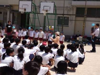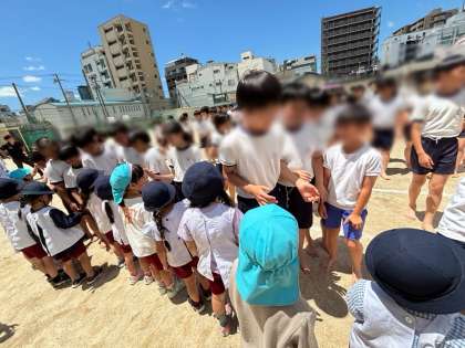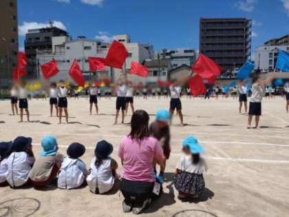 1日に運動会を控えた6年生の演技を、5歳児が見せてもらいました!組体操や旗の演技を見る子どもたちの目は、とても真剣です。「背中に乗るのがすごかった!」「かっこよかったです!!」と、子どもたちが感じたことも発表させていただきました。