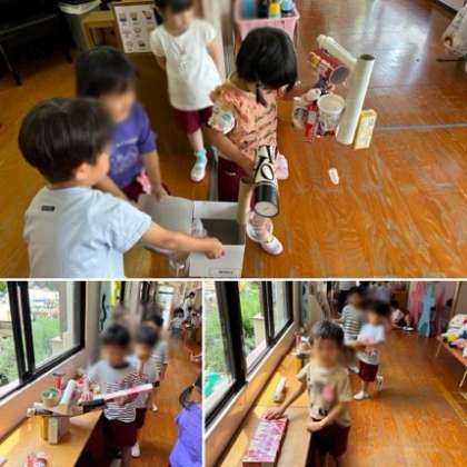 4歳児は、お家にある空き箱や筒、カップ、トレイなどの素材同士をセロテープでくっつけて遊びました。「箱さんとカップさんが仲良しになれますように!」と強く貼り付けると、だんだん電車や車、水鉄砲やロボットなどに変身しました♪