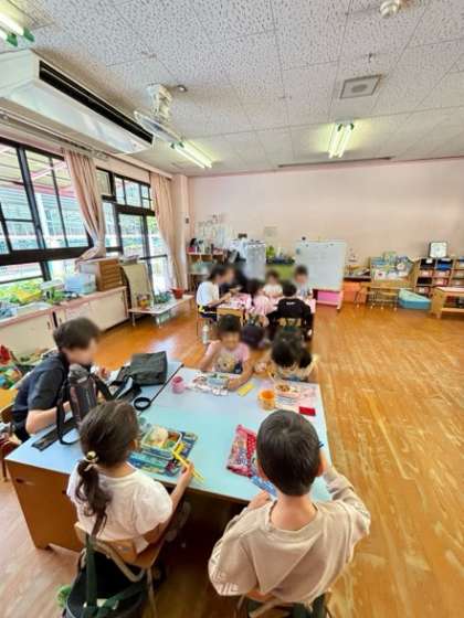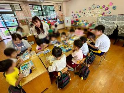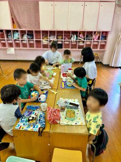 中学生のお兄さん、お姉さんと一緒にお弁当を食べました。向かい合って一緒に食べるのって、うれしいね!いろいろなことを話しながら食べるのって、楽しいね♪