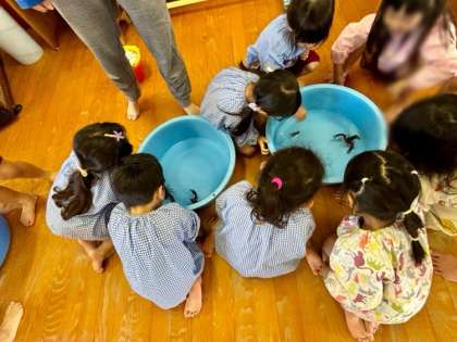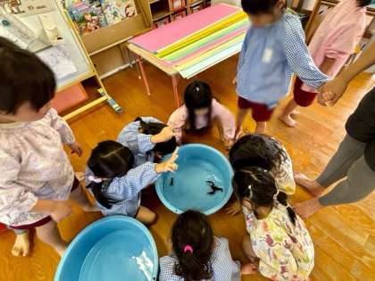 幼稚園にいるザリガニさんたちをよく見ると…「このハサミかっこいい!いちばん大きいなあ!」「この子、赤ちゃんや〜」「手がいっぱいある!」「ヒゲが長いね〜」「それ、触角って言うんやで!」と子どもたちから、大発見を伝え合う声がたくさん聞こえてきました♪