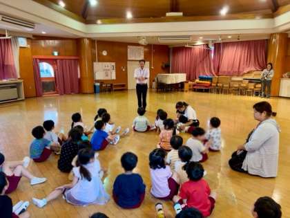 幼稚園に不審者が入ってきた時、みんなでどうやって逃げたらいいのかな?気をつけることは何かな?と、みんなで考えながら避難しました。気をつけることはどのようなことなのか、お家でも一緒に話し合ってみましょう。