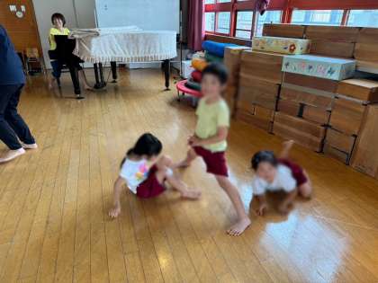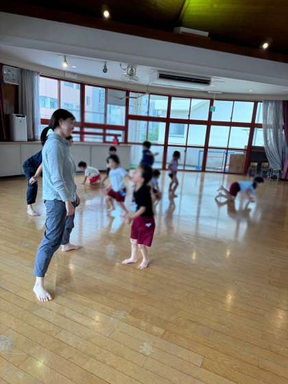 6月26日 園内研究保育(5歳児) 公開日 2024/06/27 更新日 2024/06/27 きょうのようちえん 5歳児が先生たちとリズム遊びを楽しみました♪ スキップやケンパ・スライド・トンボなど、全身を思いきり動かしてのびのびと動けるようになってきました。今回は、ダンゴムシやトンネルにも変身して、いろいろな動きを存分に楽しみました(^^)/ 大淀小学校の先生方も保育を見に来てくださいました!ありがとうございました。 いいね(0)