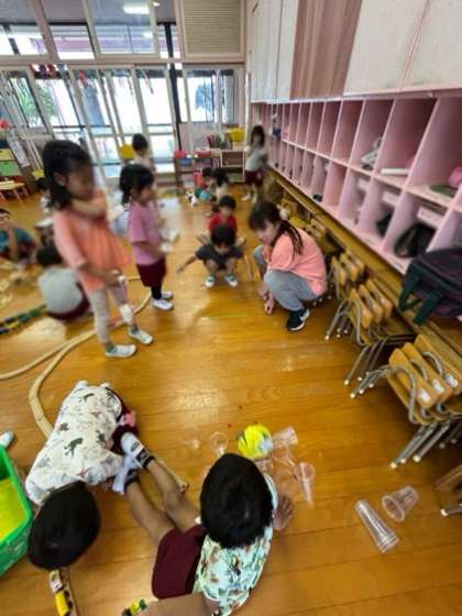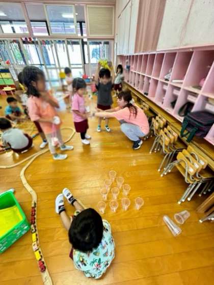 4歳児は先生と一緒に、コップボーリングに挑戦!!手づくりの新聞ボールを転がして、紙コップでつくったピンを狙います。コロコロとうまく転がすと……ストライク!!コップピンをすべて倒すことができました(^-^)v