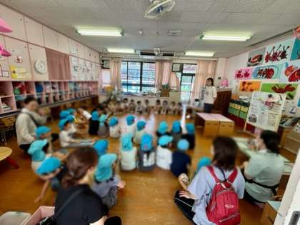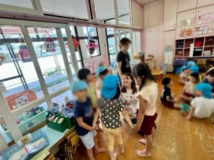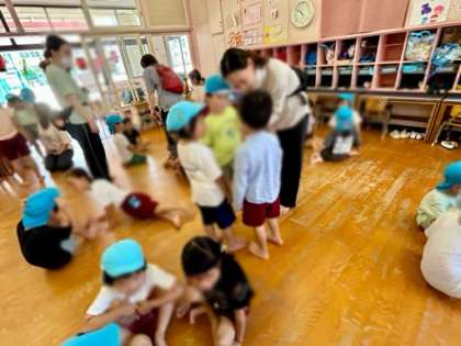大淀保育所の5歳児と幼稚園の5歳児が初めまして!の交流を行いました。一緒に体を動かしながら、いろいろな友達と名前や好きな野菜、好きな色、好きなお菓子などを伝え合うと、少しずつ表情がほぐれてきました♪( ´▽`)