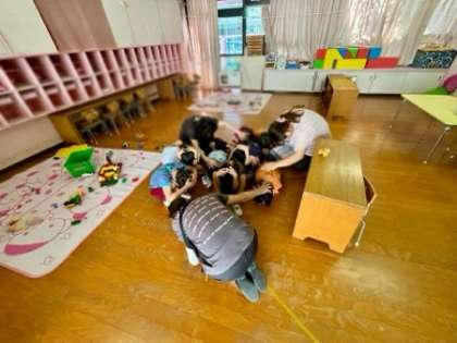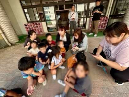 預かり保育の子どもたちは、シェイクアウトの姿勢をとった後、テラスに避難しました。そして、教職員の携帯の緊急エリアメールを子どもたちに見せながら、この音や表示について知らせました。小さな子どもたちも、命を守るために知っておくべきことです。