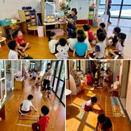 『むしむしでんしゃ』を読んだ4歳児。電車のイメージがどんどん膨らみます。どんどん膨らんで…ながーい線路になりました♪どこまで続いていくかな?