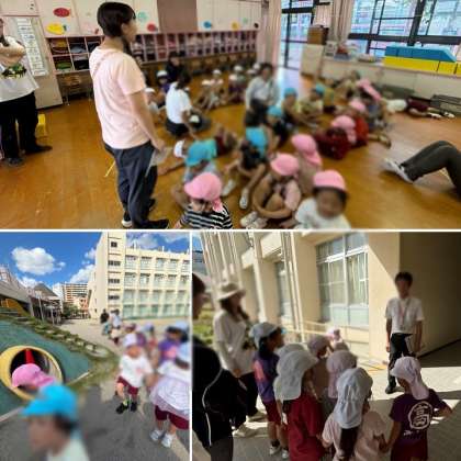 来週の園外保育を見据えて、異年齢ペアで一緒に歩いたり、ふれあい遊びを楽しんだりしました。小学校のお兄さん、お姉さんは授業中でしたが、静かに歩いたり、初めてのもの探しをすることができました!