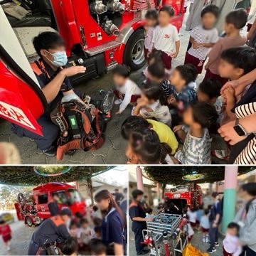 【10月25日】避難訓練◆その2 公開日 2024/10/27 更新日 2024/10/27 きょうのようちえん 気になるものや聞きたいことがいっぱいの4歳児。消防士さんが、一つ一つ答えてくださることを、目をキラキラさせながら聞いていました! いいね(0)