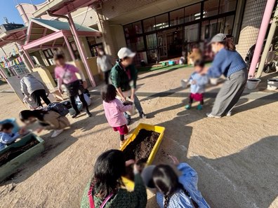 親子ふれあいチューリップ植え 公開日 2024/12/03 更新日 2024/12/03 きょうのようちえん おうちの人とチューリップを植えました。チューリップの花が咲くのは、暖かい春!その頃、4歳児は大きい組さんになりますね♪楽しみだね☆ いいね(0)