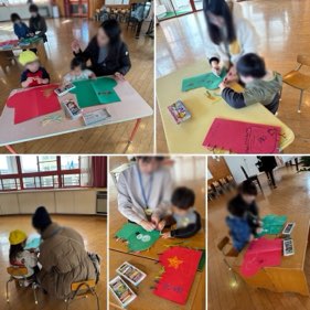 12月のはぐとこ☆ 公開日 2024/12/09 更新日 2024/12/09 きょうのようちえん 寒い中、はぐとこの友達が遊びにきてくれました♪ 今日は、みんなでサンタブーツづくり!そして、サンタさんにみんなの声が届くように、スズを鳴らして遊びました。 今年最後のはぐとこにご参加いただき、ありがとうございました!来年もお待ちしております。皆さま、良いお年をお迎えください☆ いいね(0)