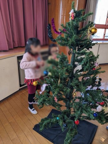 昨日、幼稚園のもみの木の飾り付けをしました♪ サンタさん、気付いてくれたかな?