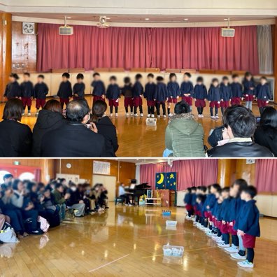 ☆プログラム3番☆ 公開日 2025/02/07 更新日 2025/02/07 きょうのようちえん 4歳児が、大好きなトライアングルをみんなで鳴らしながら入場してきました! ドキドキしながら、♪せんろはつづくよどこまでもと♪ゆきだるまのチャチャチャを聞いてもらいました。3つの楽器に分かれて、楽器遊びも楽しんだね(^-^)v いいね(0)