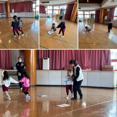 4歳児が取ったカルタを5歳児がリードしながら、一緒に次の場所まで連れて行ってくれます♪お姉さんたちの優しさがうれしい4歳児です(o^^o)