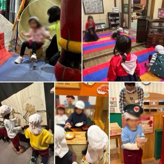 スライダーを何度も滑ったり、お寿司屋さん、郵便局員さんに変身しました!