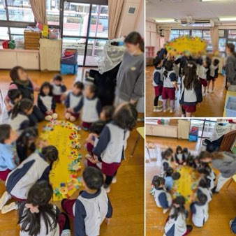 担任の先生がいない時に、プレゼントをつくりました。「先生、黄色が好きやねん、だから黄色の花びらにする」「この顔、そっくりやろ〜」「わからないようにしとかなあかん!しーっやで!しー!!」と先生が喜ぶ顔を思い浮かべながら、お花づくりを楽しみました♪